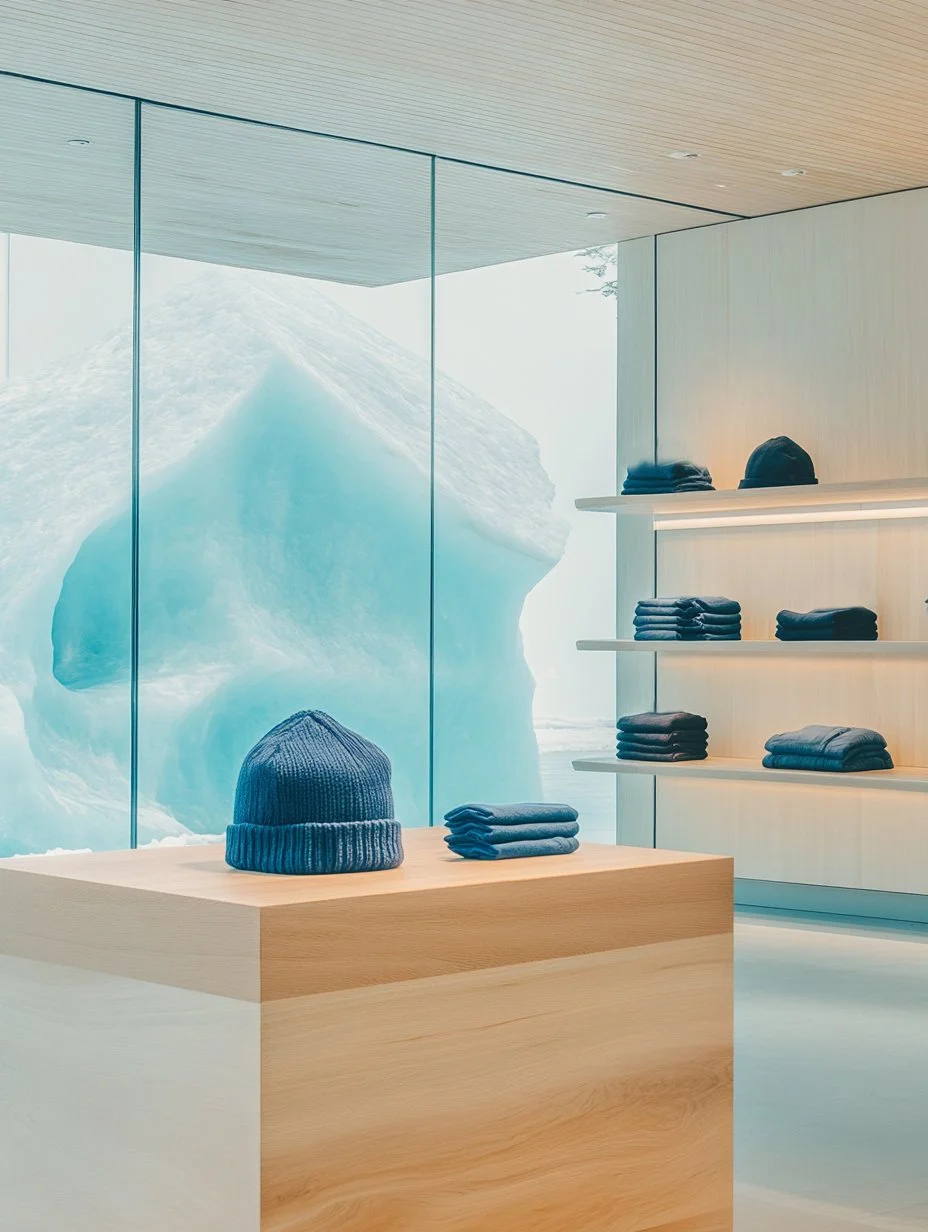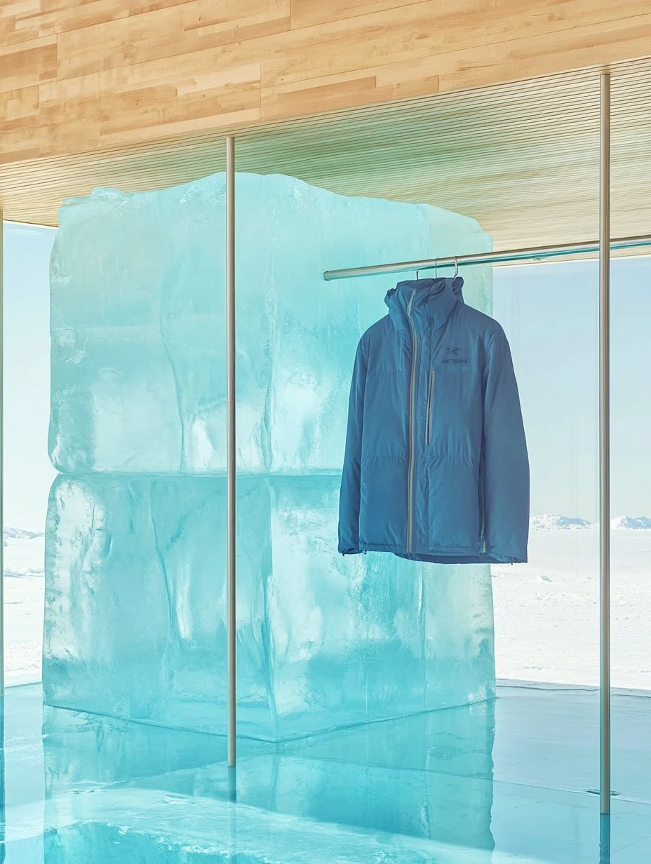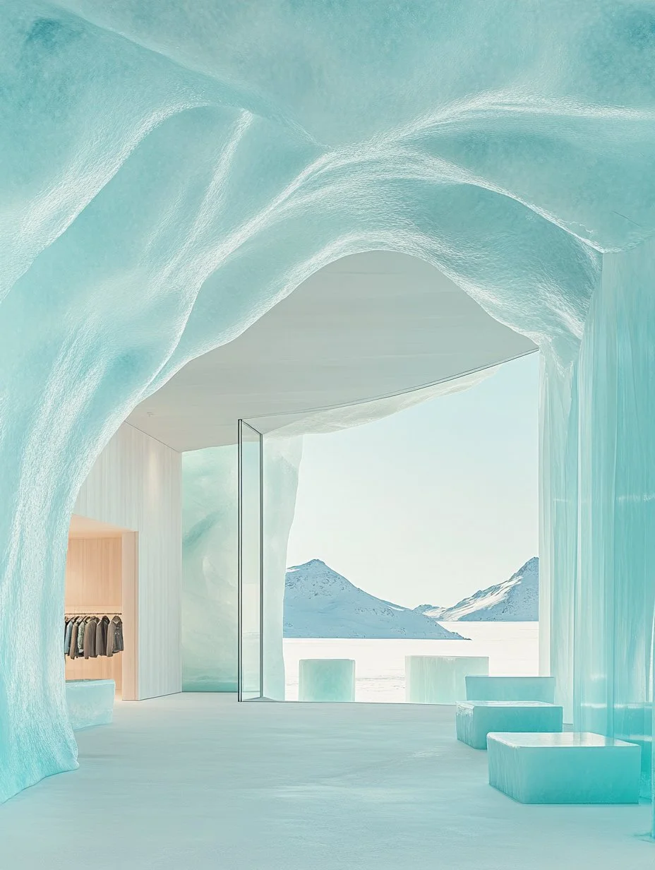 Visual exploration for Arc’teryx retail concept store in the arctic showcasing the exterior built in an iceberg, interior and product display. Midjourney used to generate the series of images.